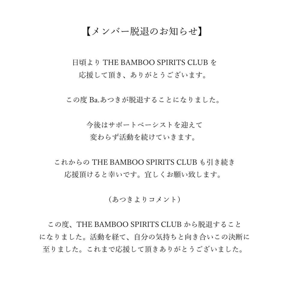 この度Ba.あつきが脱退することになりました。突然のご報告になってしまい申し訳ありません。